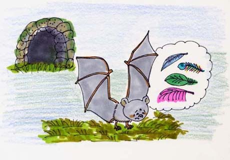 This is why bats now live in caves. They are ashamed of their looks and don't want to be seen by anyone. And as soon as the sun sets they come out of caves flying and skimming the ground, trying to find their lost feathers. | |