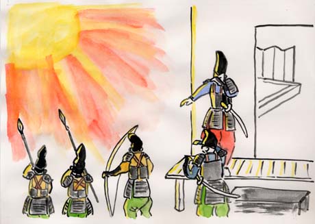 The old couple were surprised and told the Emperor what Kaguya-hime had told them. At last the day for moon people to come for Kaguya-hime. But the Emperor had fallen in love with Kaguya-hime and he sent a great number of his samurai warriors to protect her. On that night the full moon rose high in the sky. Then, as the moon shone brightly a beautiful ox cart surrounded by the moon people came dowm from the sky. Although the Samurai tried to shoot at it with their arrows, they@couldn't see a thing because@of the bright, shining light. |