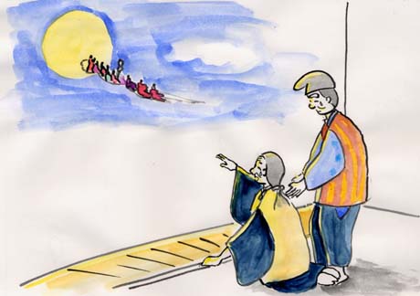 " Grandpa and Grandma, thank you very much for having taken such good care of me. Now my time has come. I must leave and return to the moon. Promise me that you will always take good care of each other and watch over your health. Good bye." With tears in her eyes Kaguya-hime said farewell to the old, got into the shining ox cart from the moon, and rose into the sky. |