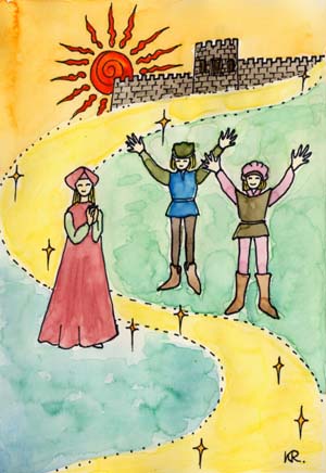 She had made glittering, beautiful gold thread. Every one in the castle was amazed by it and was happy for the prince to have found such a wonderful wife. However, the girl was not pleased at all and only cried. She was so worried about the promise to the dwarf, and scared the night would come soon. When it became dark, the prince came back from hunting. He saw the girl’s tear stained face and tried to comfort her. |