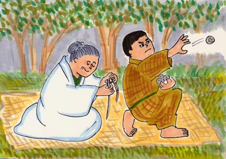After that she again tied the hemp yarn around the grain of rice, and it worked well this time.